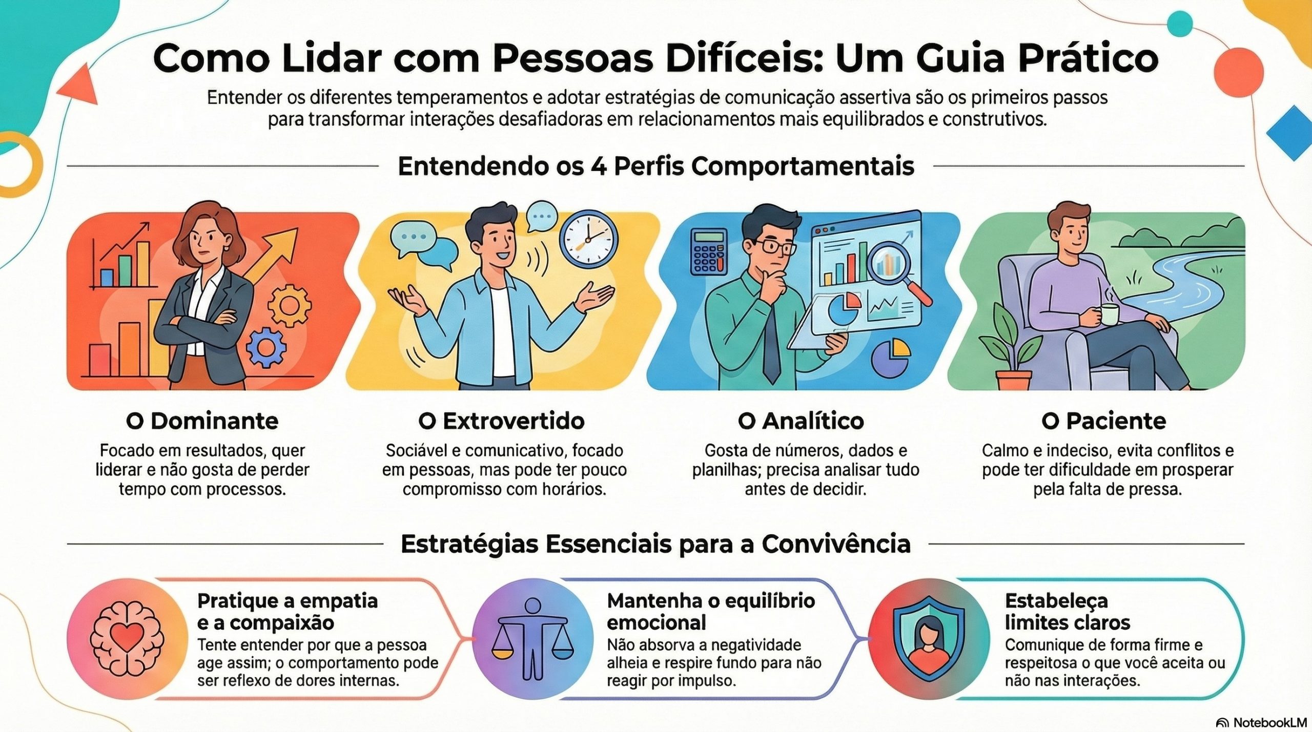 Muitas vezes, o que chamamos de dificuldade é apenas um choque de temperamentos. A ciência do comportamento humano nos mostra que existem perfis diferentes. Por exemplo, alguém com um perfil dominante é focado em resultados e pode parecer insensível ou apressado para quem tem um perfil mais paciente e relacional. Já uma pessoa muito analítica, que precisa de detalhes e dados, pode ser vista como “chata” por alguém extrovertido e dinâmico.