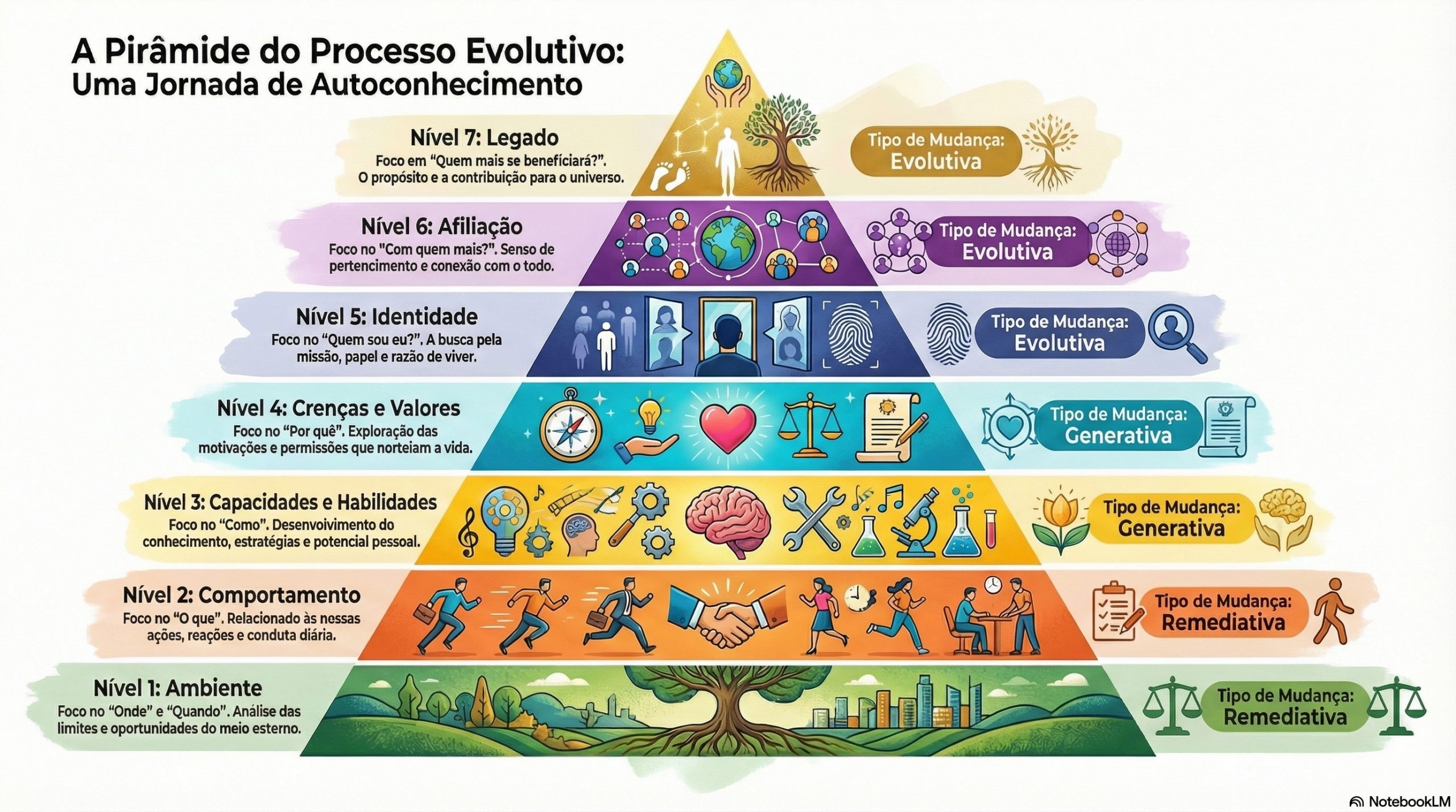 Chegamos ao ápice do processo: a Mudança Evolutiva. Este é o nível da transformação profunda, que ocorre nas esferas da Identidade, Afiliação e Espiritualidade (Legado).